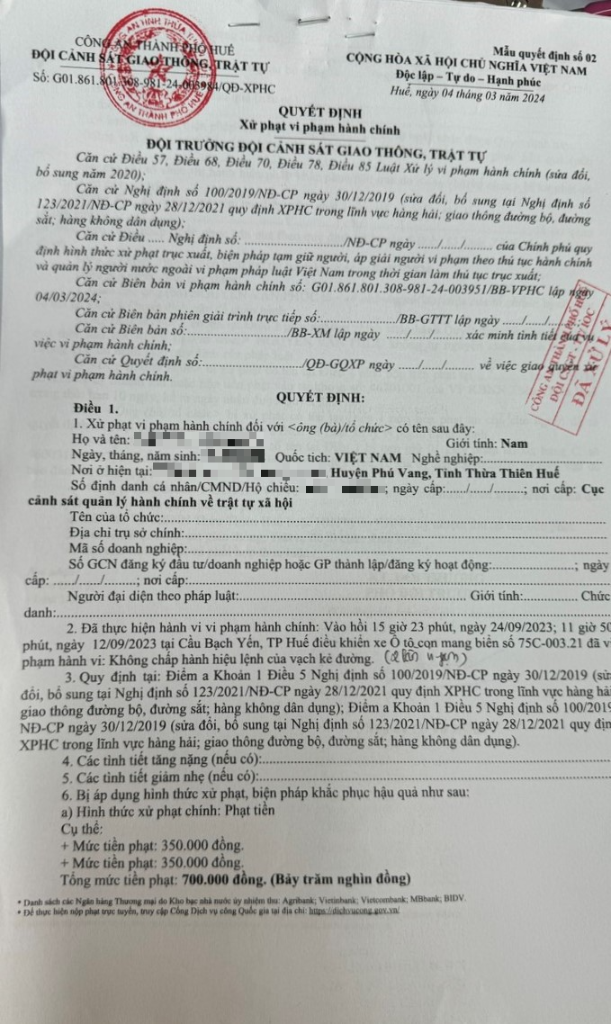 Công an thành phố cập nhật kết quả: Qua xác minh làm việc với chủ phương tiện vi phạm lỗi: Không chấp hành hiệu lệnh, chỉ dẫn của vạch kẻ đường, quy định tại điểm a, khoản 1, điều 5 Nghị định 100/2019/NĐ-CP được sửa đổi, bổ sung tại Nghị định 123/NĐ-CP ngày 28/12/2021. Ra Quyết định xử phạt 350.000đ. (Đính kèm Quyết định)