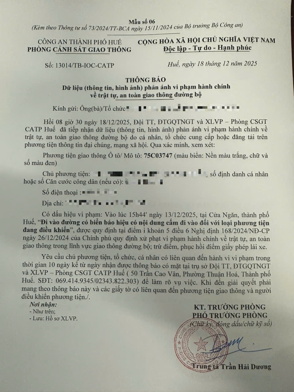 Qua hình ảnh phản ánh, Phòng Cảnh sát giao thông xác định lỗi vi phạm của người điều khiển phương tiện 75C03747 như sau: Đi vào đường có biển báo hiệu có nội dung cấm đi vào đối với loại phương tiện đang điều khiển, được quy định tại Điểm i khoản 5 Điều 6 Nghị định số 168/2024/NĐ-CP ngày 26/12/2024 của Chính phủ.