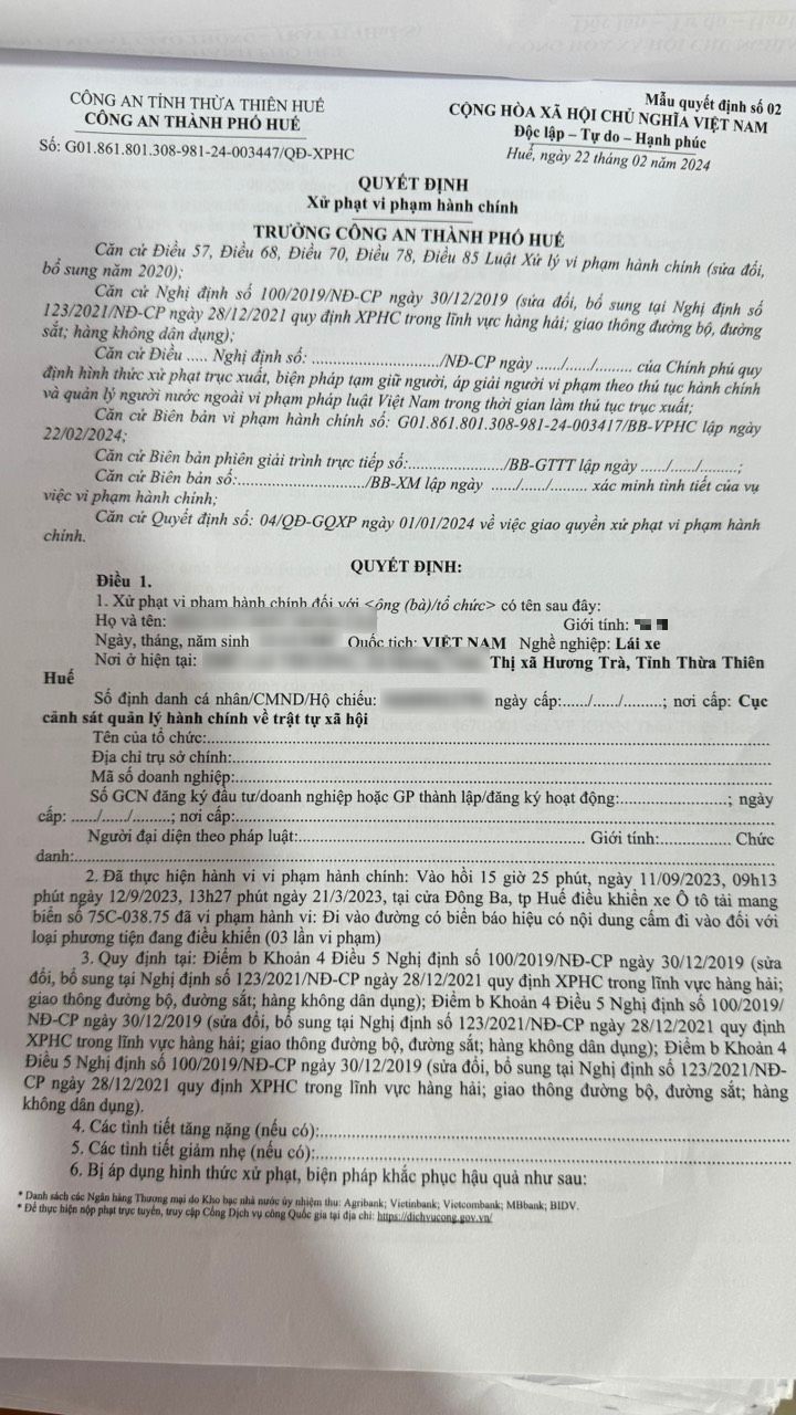 Công an thành phố Huế cập nhật quyết định xử phạt: (Đính kèm quyết định xử phạt vi phạm hành chính)