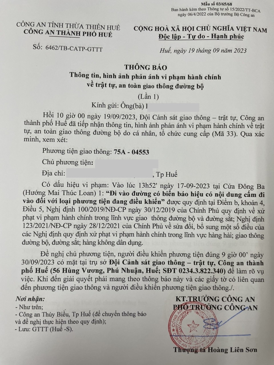 Vấn đề Ông/Bà phản ánh, Công an tỉnh đã chỉ đạo Công an thành phố Huế xác minh và xin thông báo kết quả như sau: