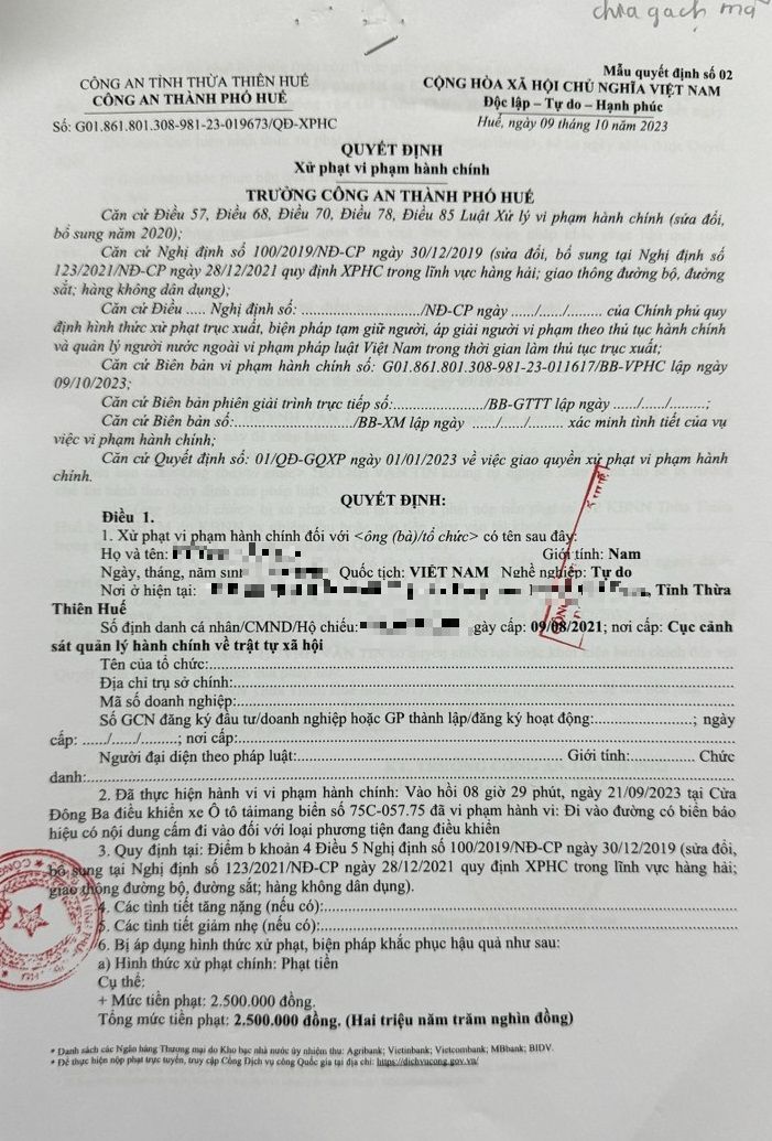 Công an thành phố đã ra Quyết định xử phạt 2.500.000 đồng, tước quyền sử dụng Giấy phép lái xe 02 tháng đối với người điều khiển phương tiện.