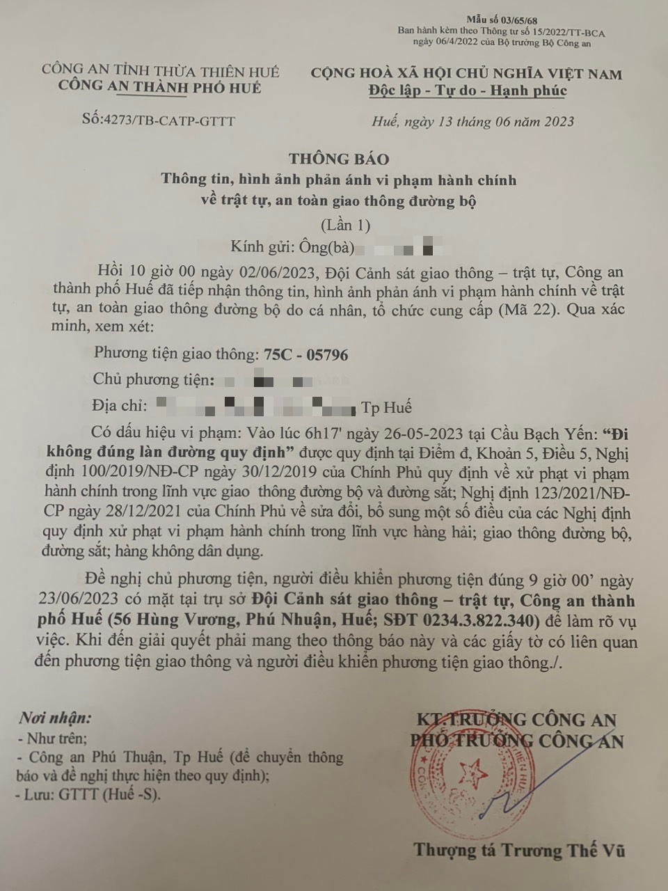 Qua xác minh làm việc với chủ phương tiện vi phạm lỗi: Không chấp hành hiệu lệnh, chỉ dẫn của vạch kẻ đường, quy định tại điểm a, khoản 1, điều 5 Nghị định 100/2019/NĐ-CP được sửa đổi, bổ sung tại Nghị định 123/NĐ-CP ngày 28/12/2021. Ra Quyết định xử phạt 350.000đ. (Đính kèm Quyết định)