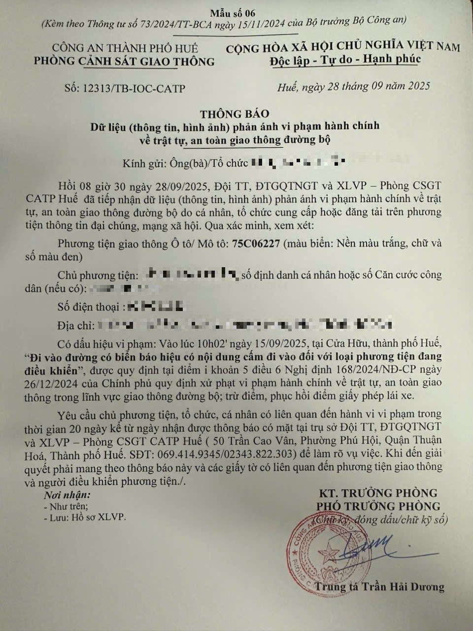 Qua hình ảnh phản ánh, Phòng Cảnh sát giao thông xác định lỗi vi phạm của người điều khiển phương tiện 75C06227 như sau: Đi vào đường có biển báo hiệu có nội dung cấm đi vào đối với loại phương tiện đang điều khiển, được quy định tại Điểm i khoản 5 Điều 6 Nghị định số 168/2024/NĐ-CP ngày 26/12/2024 của Chính phủ.