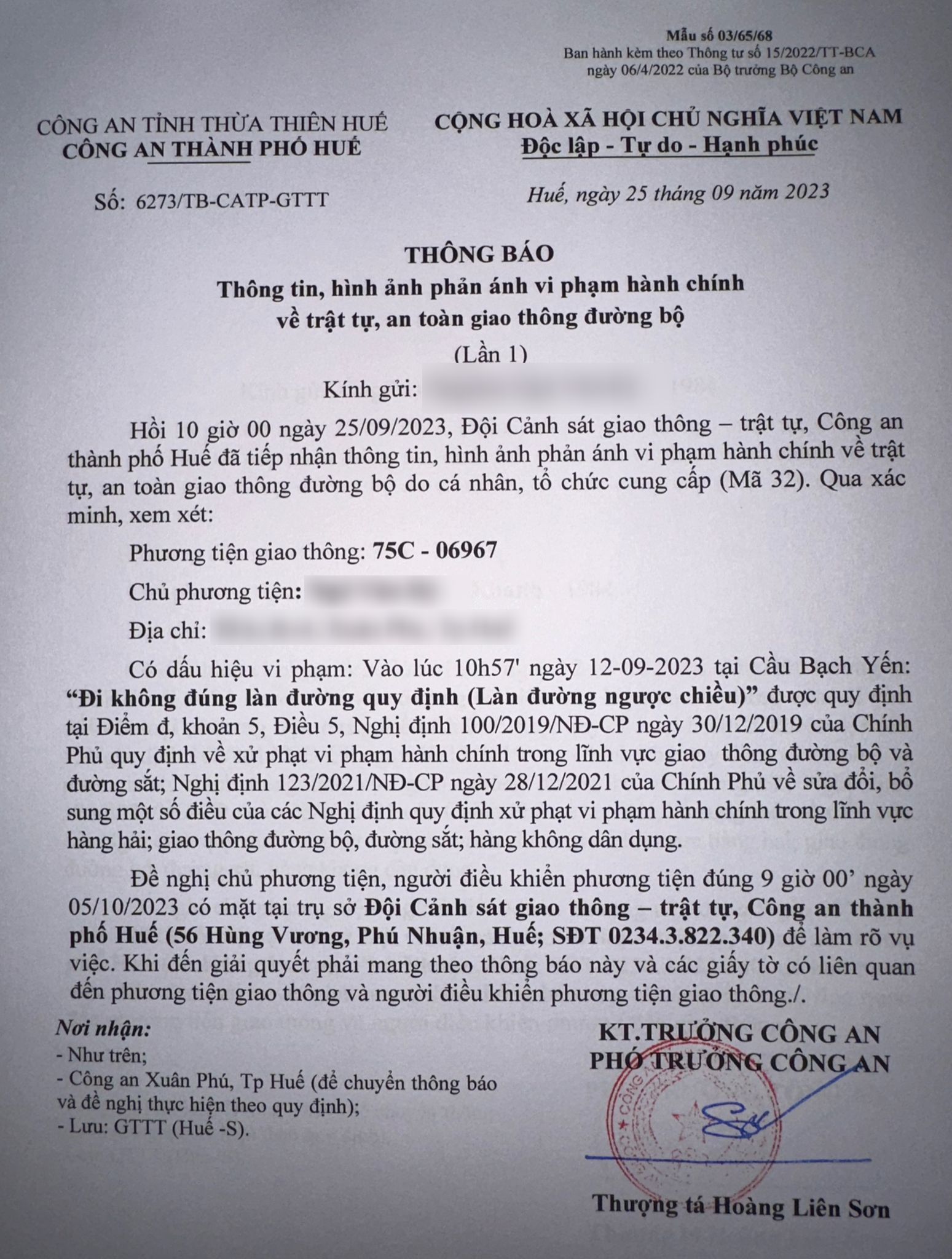 Công an thành phố cập nhật kết quả: Qua xác minh làm việc với chủ phương tiện vi phạm lỗi: Không chấp hành hiệu lệnh, chỉ dẫn của vạch kẻ đường, quy định tại điểm a, khoản 1, điều 5 Nghị định 100/2019/NĐ-CP được sửa đổi, bổ sung tại Nghị định 123/NĐ-CP ngày 28/12/2021. Ra Quyết định xử phạt 350.000đ. (Đính kèm Quyết định)