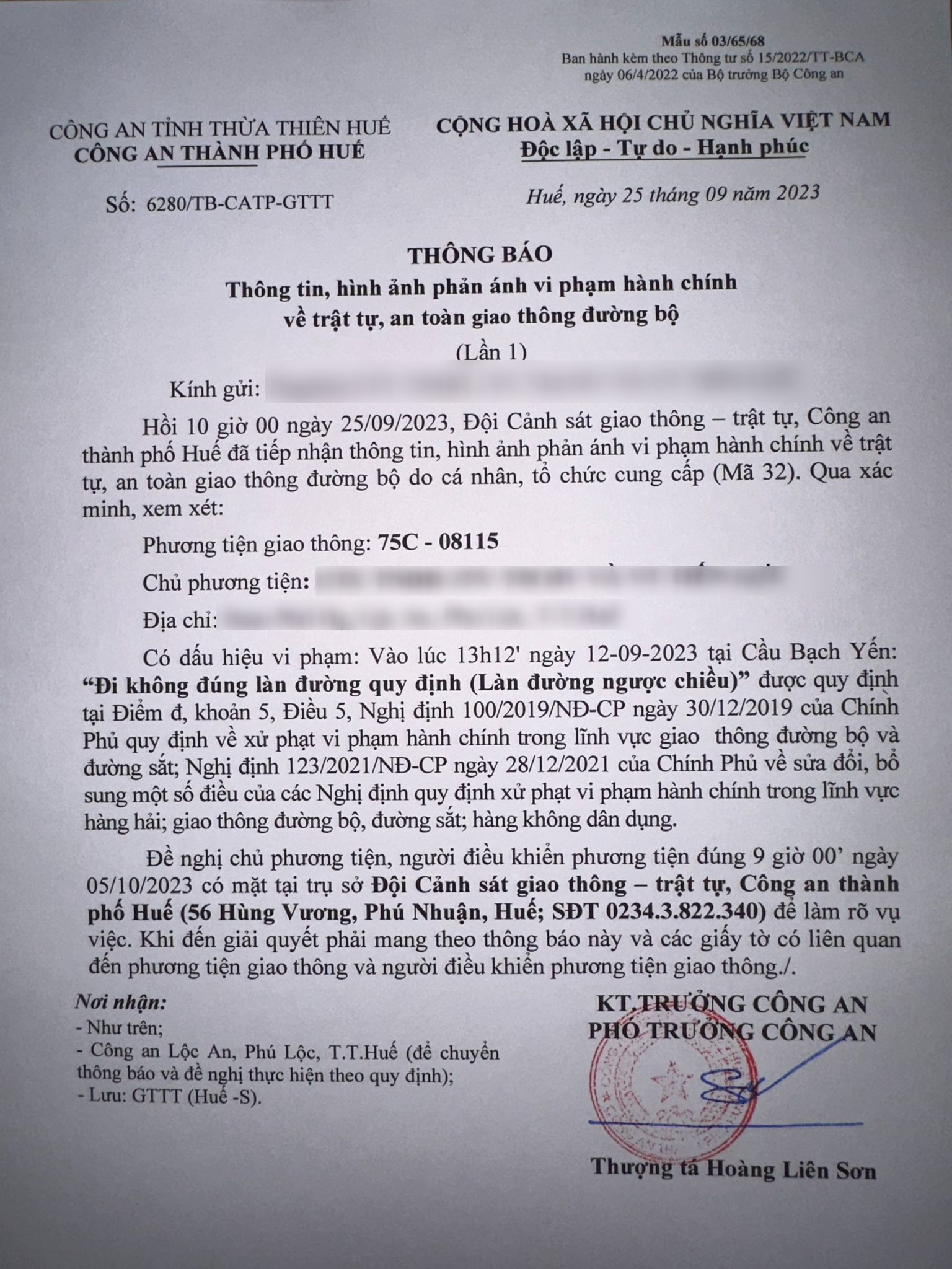 Công an thành phố cập nhật kết quả: Qua xác minh làm việc với chủ phương tiện vi phạm lỗi: Không chấp hành hiệu lệnh, chỉ dẫn của vạch kẻ đường, quy định tại điểm a, khoản 1, điều 5 Nghị định 100/2019/NĐ-CP được sửa đổi, bổ sung tại Nghị định 123/NĐ-CP ngày 28/12/2021. Ra Quyết định xử phạt 350.000đ. (Đính kèm Quyết định)
