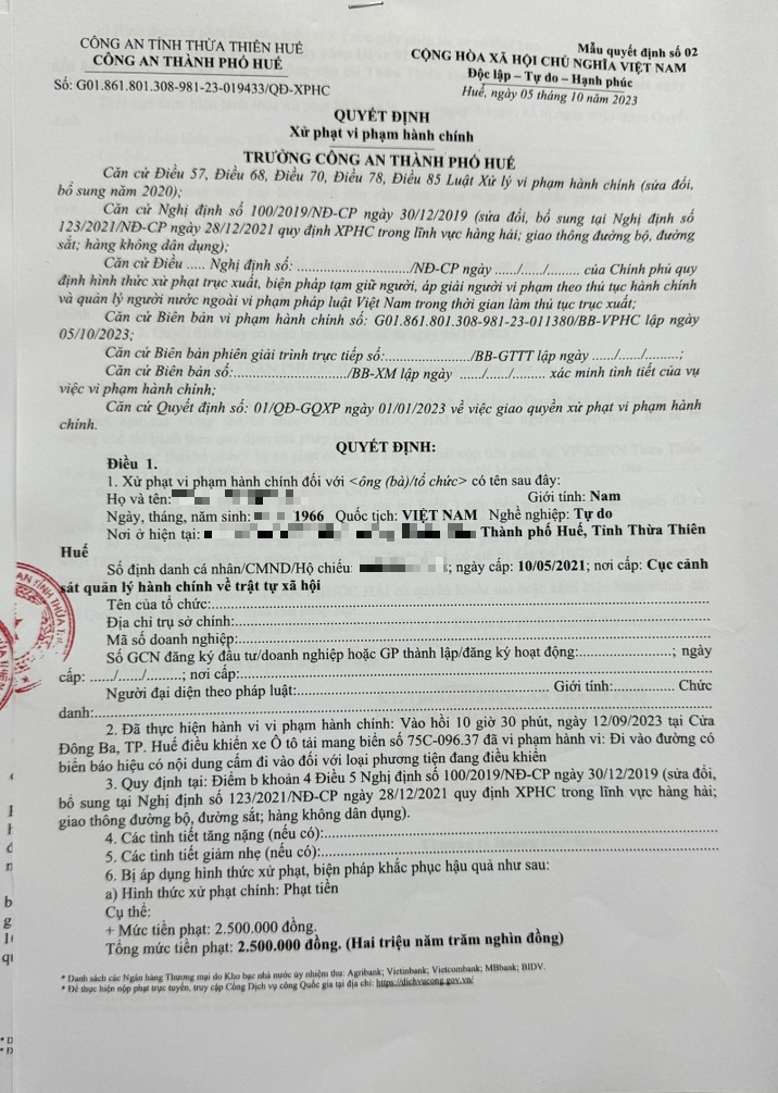 Công an thành phố Huế đã lập biên bản vi phạm hành chính và ra Quyết định xử phạt đối với chủ phương tiện về lỗi trên phạt tiền 2,5 triệu đồng, tước GPLX 02 tháng. (Đính kèm Quyết định)