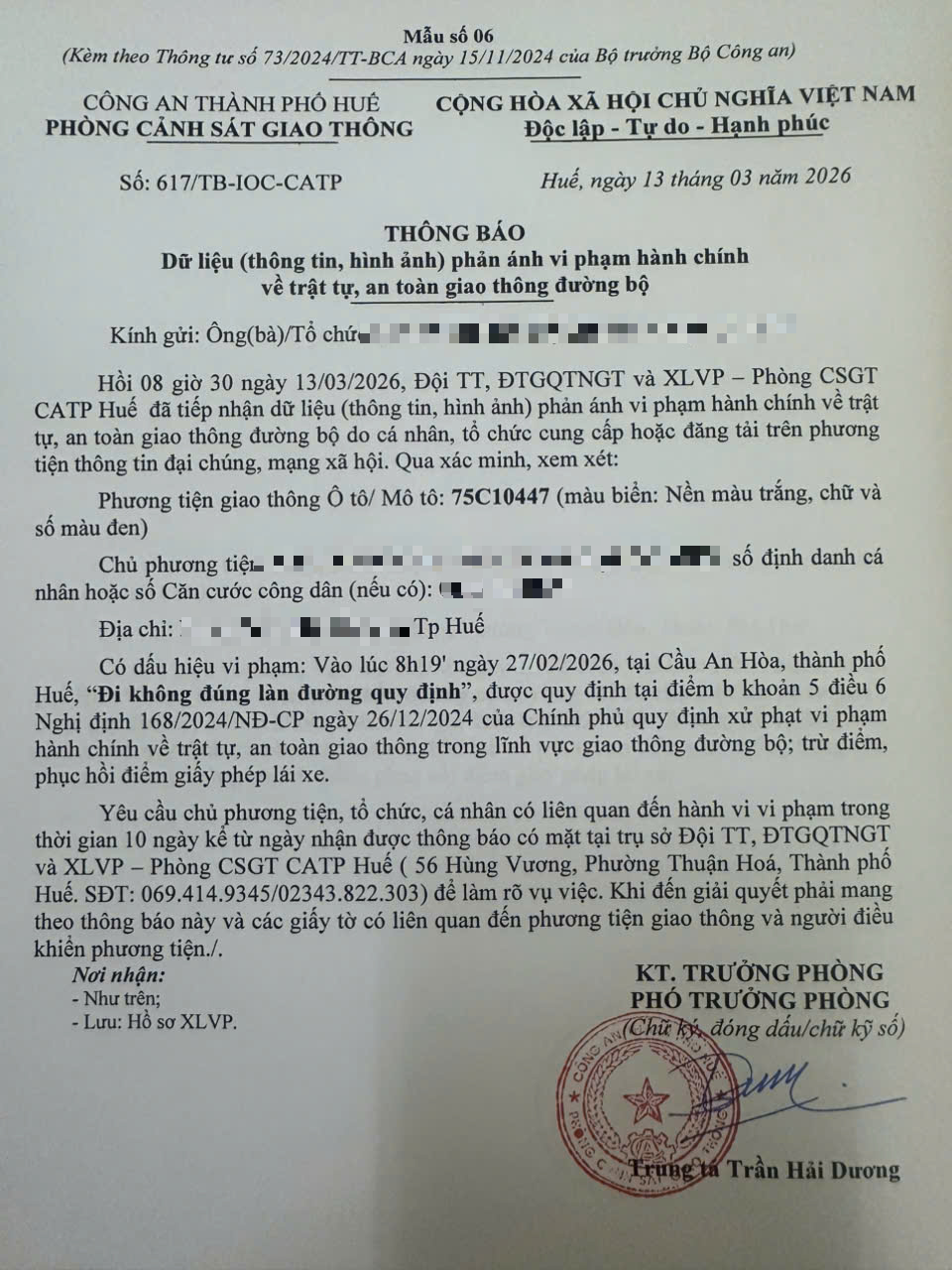 Qua hình ảnh phản ánh, Phòng Cảnh sát giao thông xác định lỗi vi phạm của người điều khiển phương tiện BKS 75C10447 như sau: “Đi không đúng làn đường quy định”, quy định tại điểm b, khoản 5, điều 6 Nghị định 168/2024/NĐ-CP.