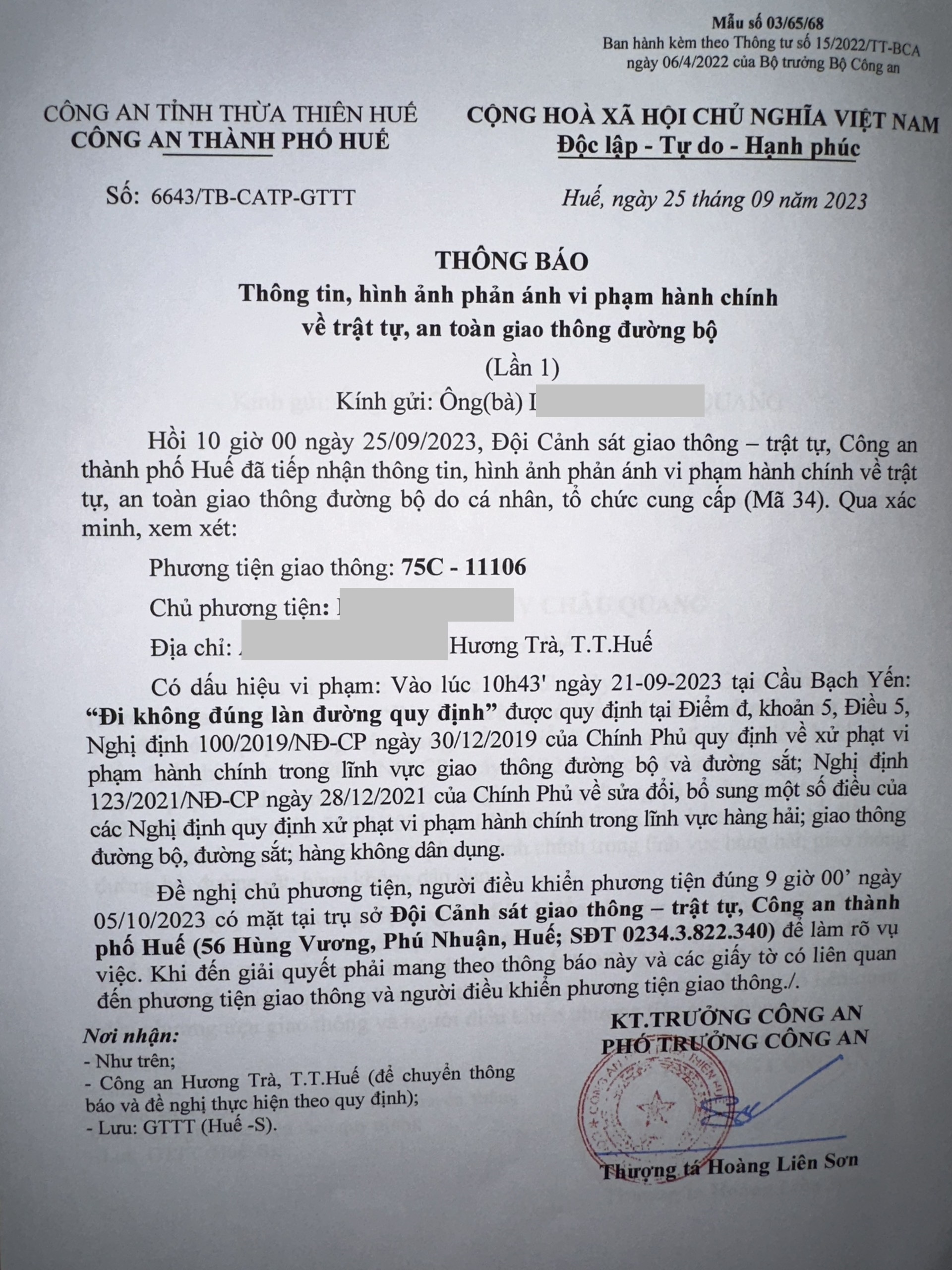 Công an thành phố cập nhật kết quả: Qua xác minh làm việc với chủ phương tiện vi phạm lỗi: Không chấp hành hiệu lệnh, chỉ dẫn của vạch kẻ đường, quy định tại điểm a, khoản 1, điều 5 Nghị định 100/2019/NĐ-CP được sửa đổi, bổ sung tại Nghị định 123/NĐ-CP ngày 28/12/2021. Ra Quyết định xử phạt 350.000đ. (Đính kèm Quyết định)