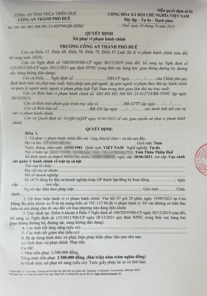 Công an thành phố Huế đã lập biên bản vi phạm hành chính và ra Quyết định xử phạt đối với chủ phương tiện phạt tiền 2,5 triệu đồng, tước GPLX 02 tháng. (Đính kèm Quyết định).