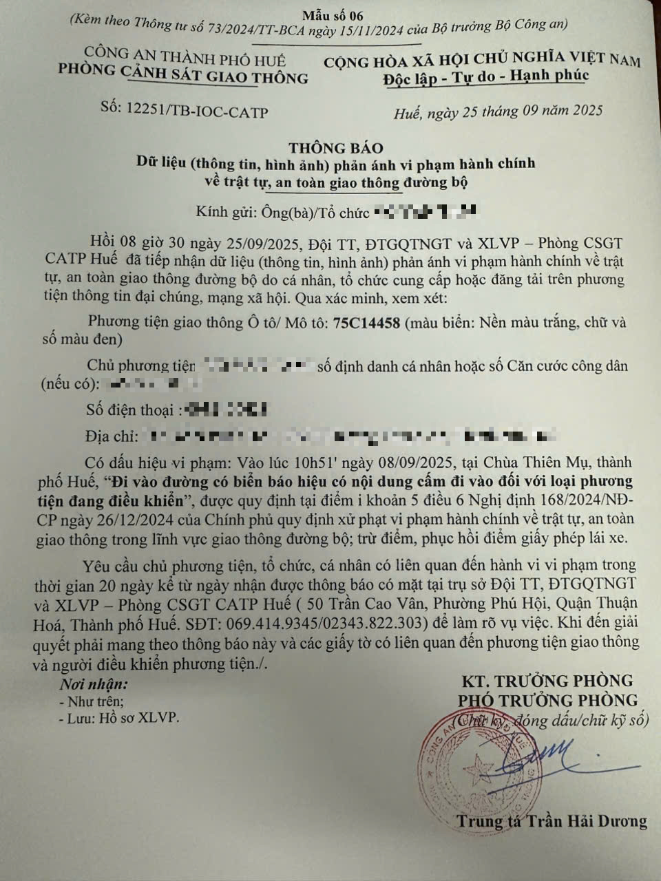 Qua hình ảnh phản ánh, Phòng Cảnh sát giao thông xác định lỗi vi phạm của người điều khiển phương tiện 75C14458 như sau: Đi vào đường có biển báo hiệu có nội dung cấm đi vào đối với loại phương tiện đang điều khiển, được quy định tại Điểm i khoản 5 Điều 6 Nghị định số 168/2024/NĐ-CP ngày 26/12/2024 của Chính phủ.