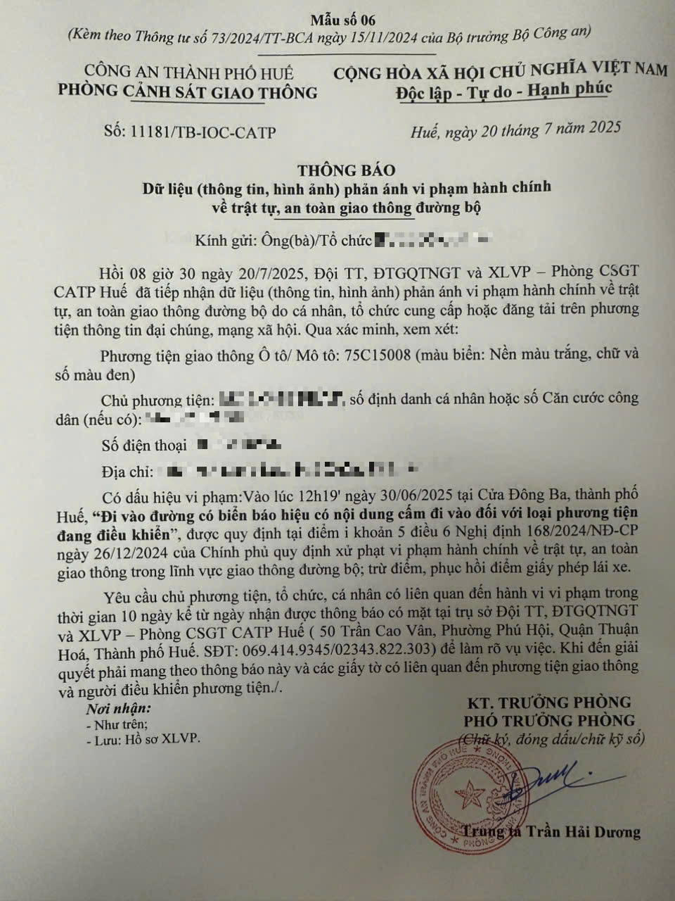 Qua hình ảnh phản ánh, Phòng Cảnh sát giao thông xác định lỗi vi phạm của người điều khiển phương tiện 75C15008 như sau: Đi vào đường có biển báo hiệu có nội dung cấm đi vào đối với loại phương tiện đang điều khiển, được quy định tại Điểm i khoản 5 Điều 6 Nghị định số 168/2024/NĐ-CP ngày 26/12/2024 của Chính phủ.