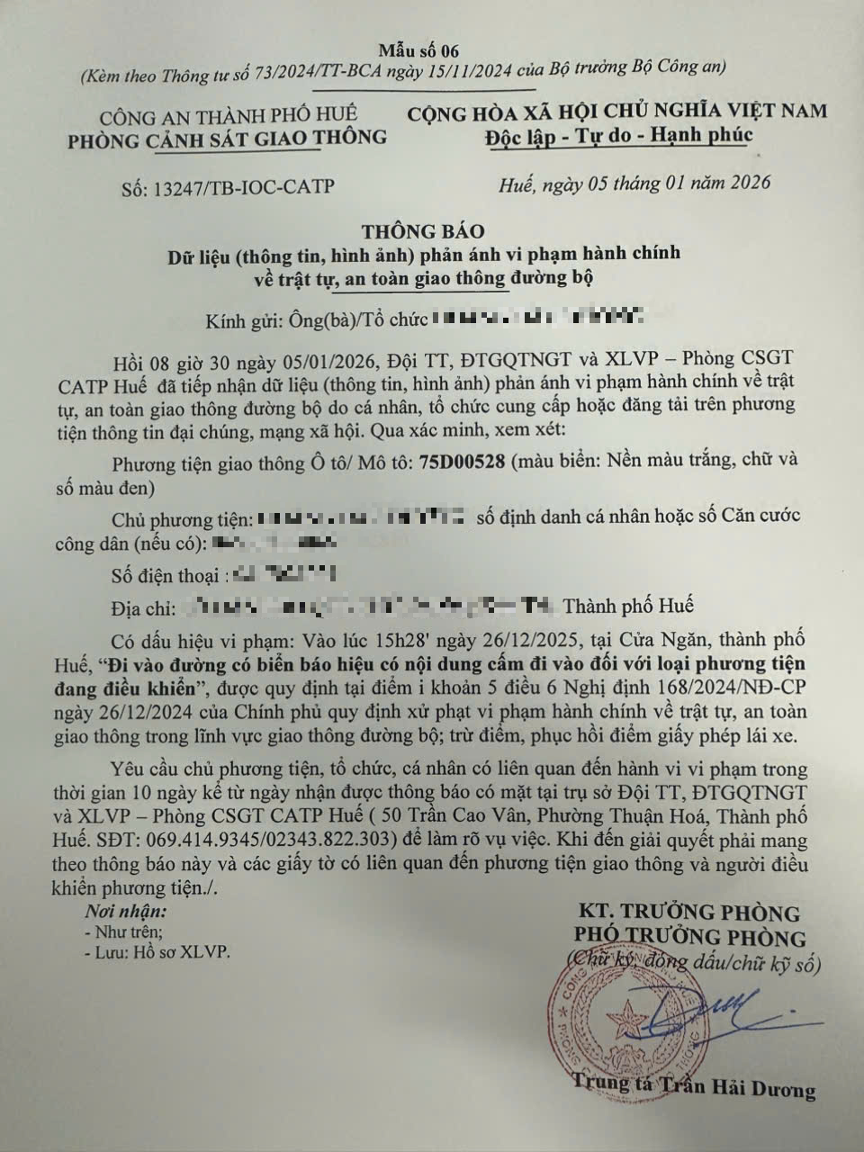 Qua hình ảnh phản ánh, Phòng Cảnh sát giao thông xác định lỗi vi phạm của người điều khiển phương tiện 75D00528 như sau: Đi vào đường có biển báo hiệu có nội dung cấm đi vào đối với loại phương tiện đang điều khiển, được quy định tại Điểm i khoản 5 Điều 6 Nghị định số 168/2024/NĐ-CP ngày 26/12/2024 của Chính phủ.