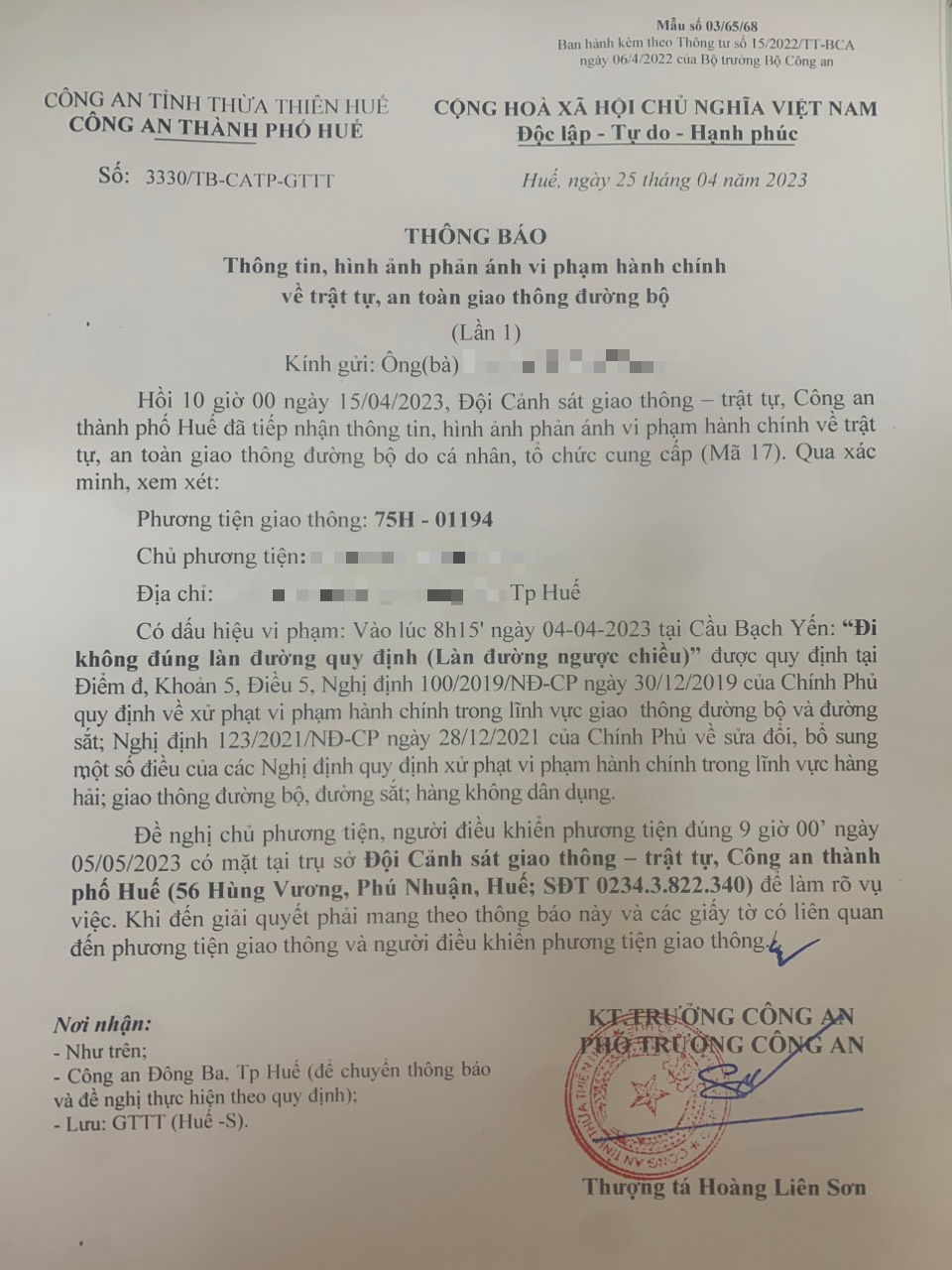 Vấn đề quý Ông/Bà phản ánh, Công an tỉnh đã chỉ đạo Công an thành phố Huế kiểm tra và xin thông báo kết quả xử lý như sau: