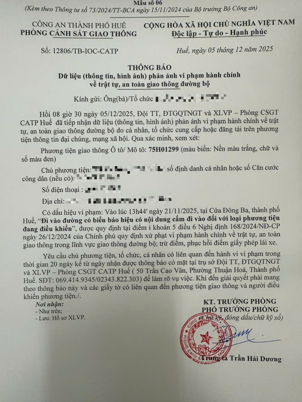 Qua hình ảnh phản ánh, Phòng Cảnh sát giao thông xác định lỗi vi phạm của người điều khiển phương tiện 75H01299 như sau: Đi vào đường có biển báo hiệu có nội dung cấm đi vào đối với loại phương tiện đang điều khiển, được quy định tại Điểm i khoản 5 Điều 6 Nghị định số 168/2024/NĐ-CP ngày 26/12/2024 của Chính phủ.