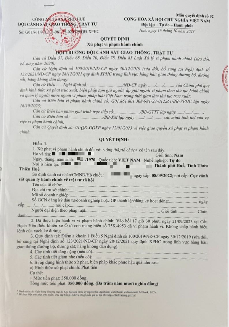 Công an thành phố Huế đã lập biên bản vi phạm hành chính và ra Quyết định xử phạt đối với chủ phương tiện phạt tiền 350.000đ. (Đính kèm Quyết định)