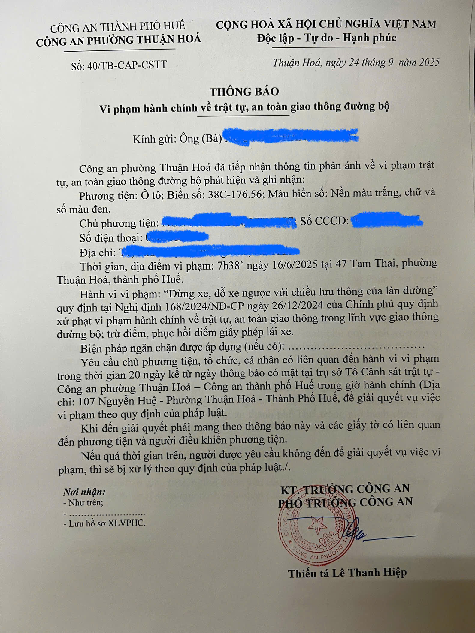 Công an phường Thuận Hóa đã lập hồ sơ, thông báo chủ phương tiện đến làm việc. Nếu quá ngày hẹn mà chủ phương tiện vẫn chưa đến trình diện tại cơ quan. Công an phường Thuận Hóa sẽ gửi thông báo cho cơ quan đăng kiểm để đưa phương tiện vào cảnh báo trên Chương trình Quản lý kiểm định.
