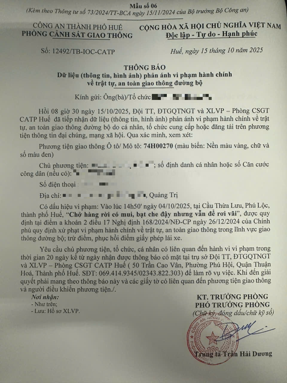 Vấn đề quý Ông/Bà phản ánh, Phòng Cảnh sát giao thông – Công an thành phố Huế đã kiểm tra và xin thông báo kết quả như sau: