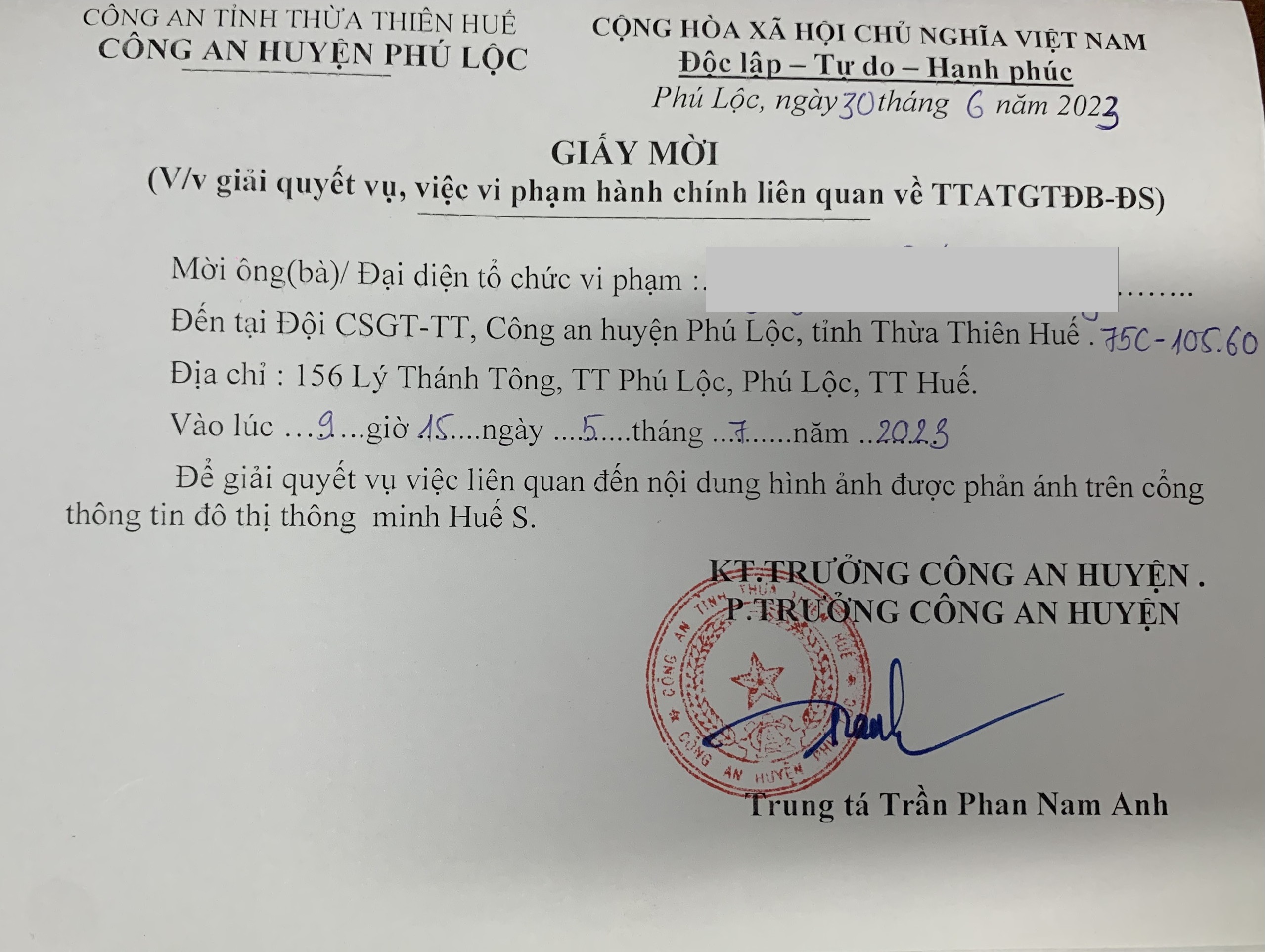 Sau khi nhận được thông tin, Công an huyện Phú Lộc đã tiến hành xác minh, gọi điện thoại thông báo đến 02 chủ xe trên đến làm việc để làm rõ hành vi vi phạm. Tuy nhiên, đến ngày 29/6/2023 vẫn chưa đến làm việc. Sau đó, đến ngày 30/6/2023, Công an huyện Phú Lộc đã tiến hành gửi giấy mời (có giấy mời kèm theo). Tuy nhiên, đến nay 02 chủ xe vẫn chưa đến làm việc. Công an huyện Phú Lộc sẽ gửi thông báo đến cơ quan đăng kiểm để đưa 02 phương tiện trên vào danh sách cảnh báo trên chương trình quản lý kiểm định.