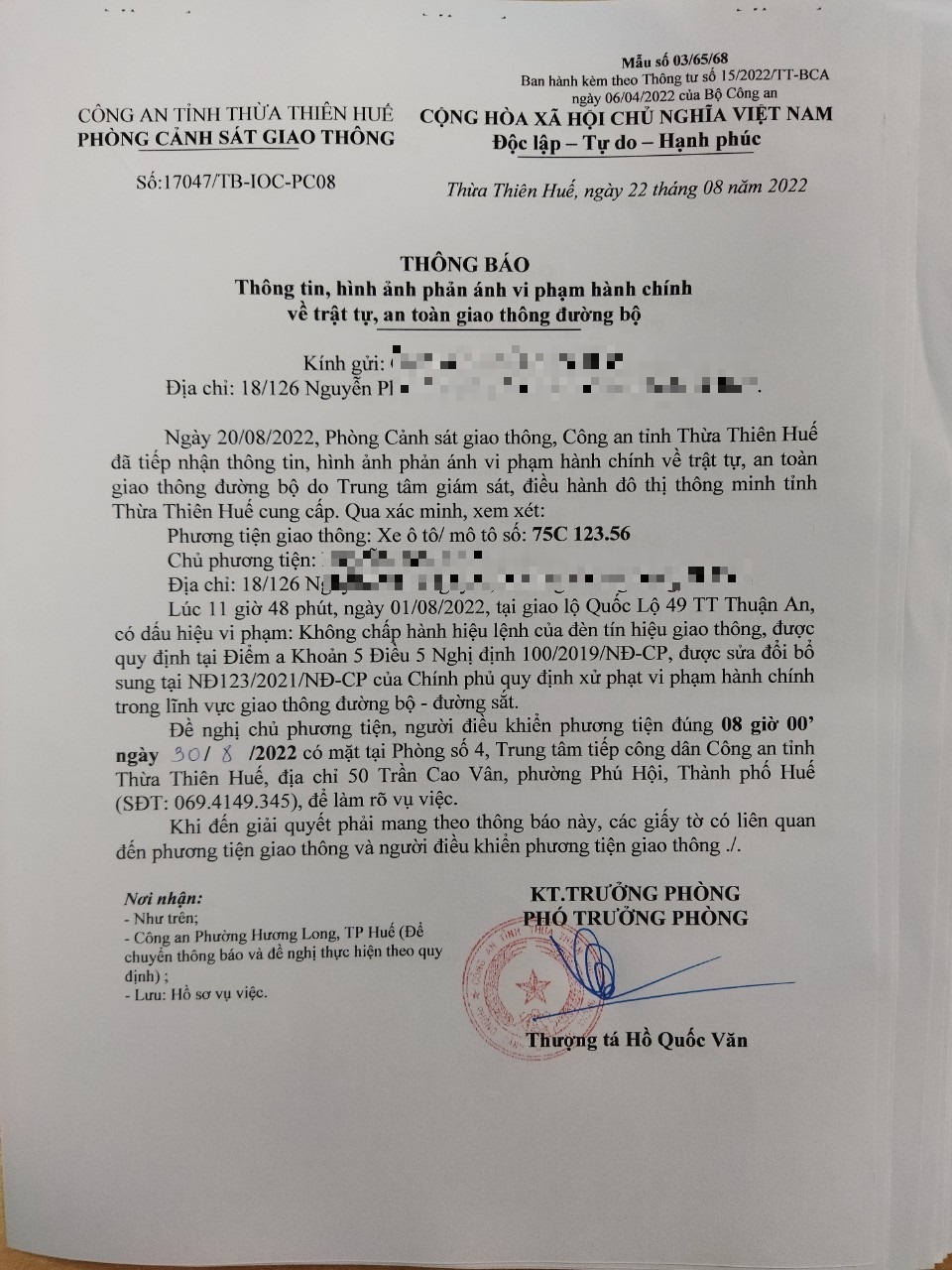 Phòng Cảnh sát giao thông đã lập hồ sơ, thông báo chủ phương tiện làm việc vào ngày 30/8/2022. Tuy nhiên, hiện chủ phương tiện vẫn chưa trình diện tại cơ quan. Phòng Cảnh sát giao thông sẽ gửi thông báo cho cơ quan đăng kiểm để đưa phương tiện vào cảnh báo trên Chương trình Quản lý kiểm định.