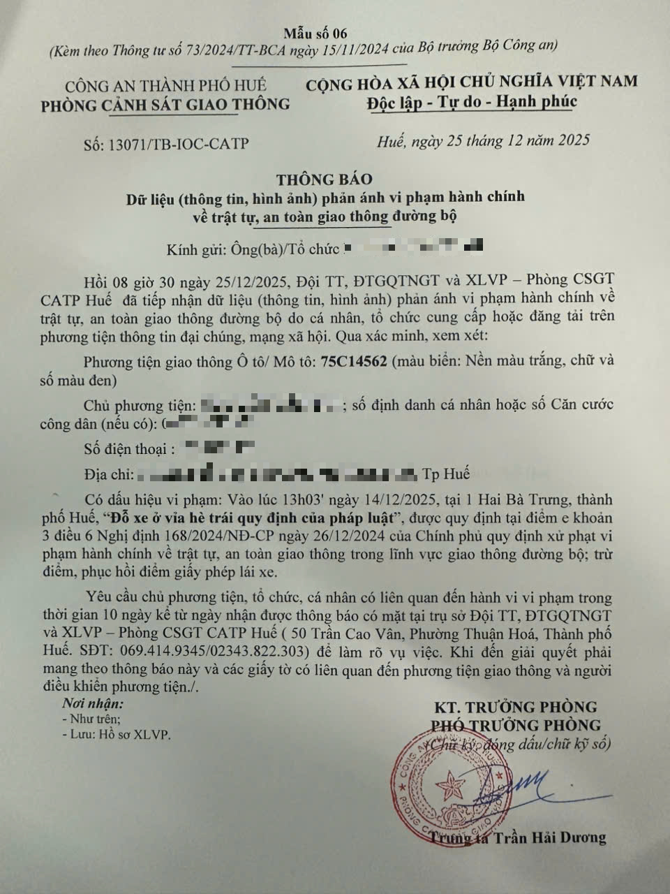 Qua hình ảnh phản ánh, Phòng Cảnh sát giao thông xác định lỗi vi phạm của người điều khiển phương tiện 75C14562 như sau: Đỗ xe ở vìa hè trái quy định của pháp luật, được quy định tại Điểm e khoản 3 Điều 6 Nghị định số 168/2024/NĐ-CP ngày 26/12/2024 của Chính phủ.