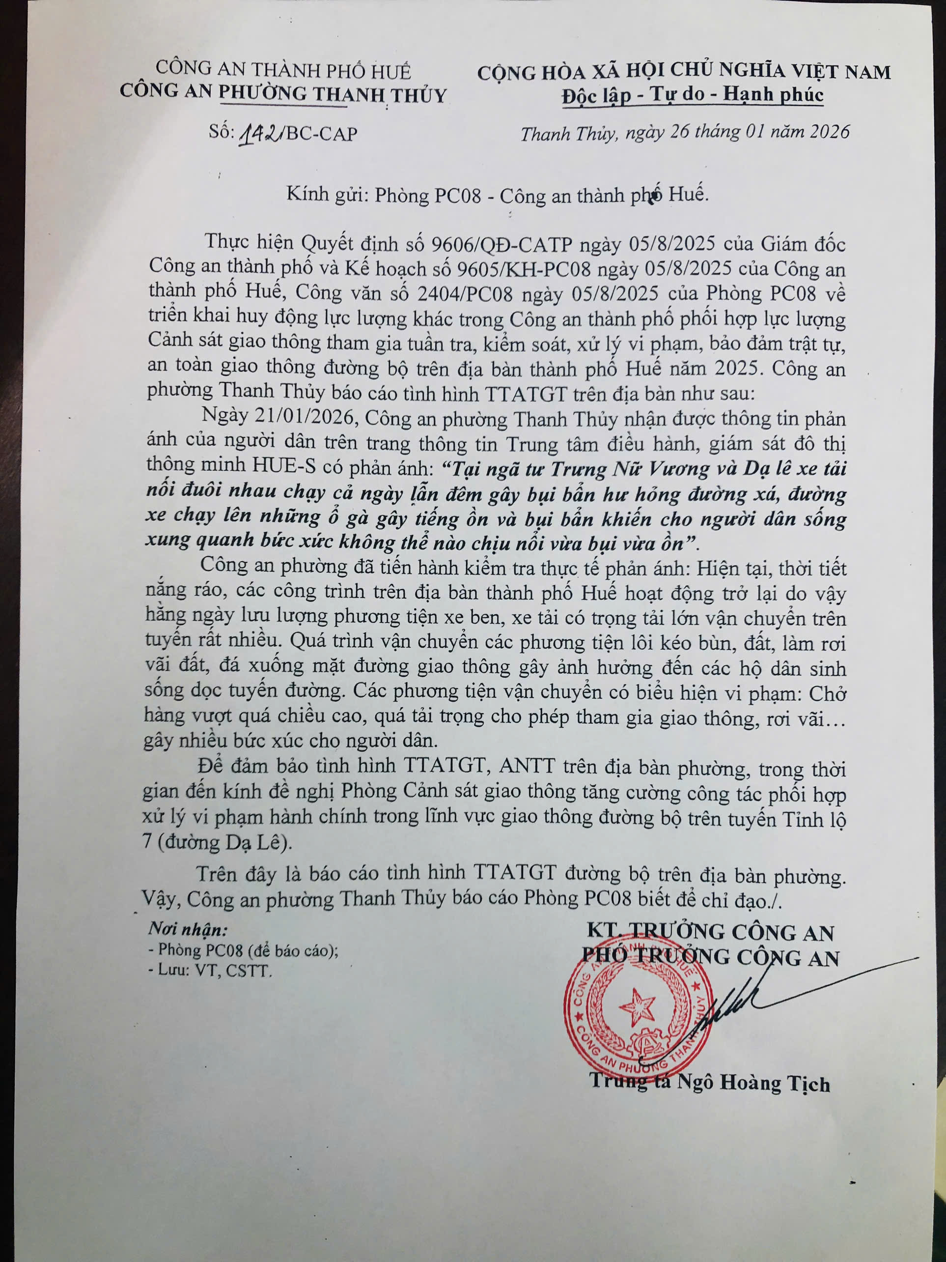Hiện nay, trên tuyến đường Dạ Lê (Tỉnh lộ 7) tập trung nhiều mỏ đất phục vụ san lấp cho các công trình trên địa bàn thành phố. Công an phường đã cử cán bộ kiểm tra, xác minh thực tế tại tuyến đường theo nội dung phản ánh và ghi nhận vào thời điểm thời tiết nắng ráo, lưu lượng phương tiện vận chuyển đất san lấp lưu thông với mật độ lớn.