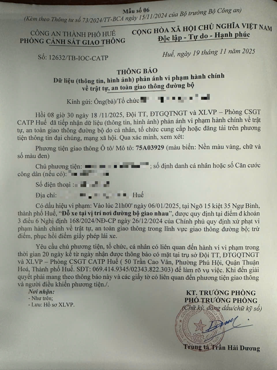 Qua hình ảnh phản ánh, người điều khiển phương tiện BKS 75A03929 có dấu hiệu vi phạm lỗi: Đỗ xe tại vị trí nơi đường bộ giao nhau, quy định tại điểm đ, khoản 3, điều 6 Nghị định 168/2024/NĐ-CP.
