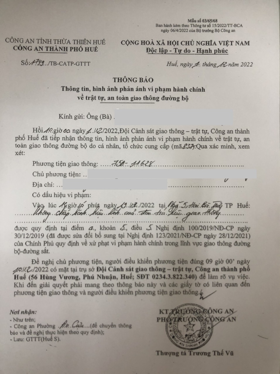 Công an thành phố đã lập hồ sơ, thông báo chủ phương tiện làm việc vào ngày 08/12/2022. Tuy nhiên, hiện chủ phương tiện vẫn chưa trình diện tại cơ quan. Công an thành phố sẽ gửi thông báo cho cơ quan đăng kiểm để đưa phương tiện vào cảnh báo trên Chương trình Quản lý kiểm định.