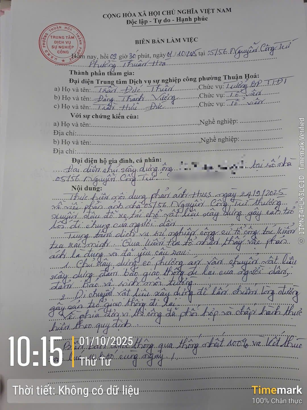 Trung tâm Dịch vụ sự nghiệp công phường Thuận Hoá chỉ đạo bộ phận liên quan tiến hành kiểm tra thực tế tại số nhà 5/56 Nguyễn Công Trứ, lực lượng đã tiến hành nhắc nhở và lập biên bản làm việc với chủ công trình yêu cầu chủ công trình không được để xe chở vật liệu chắn ngang lối đi chung của người dân. (Đính kèm biên bản làm việc và hình ảnh)