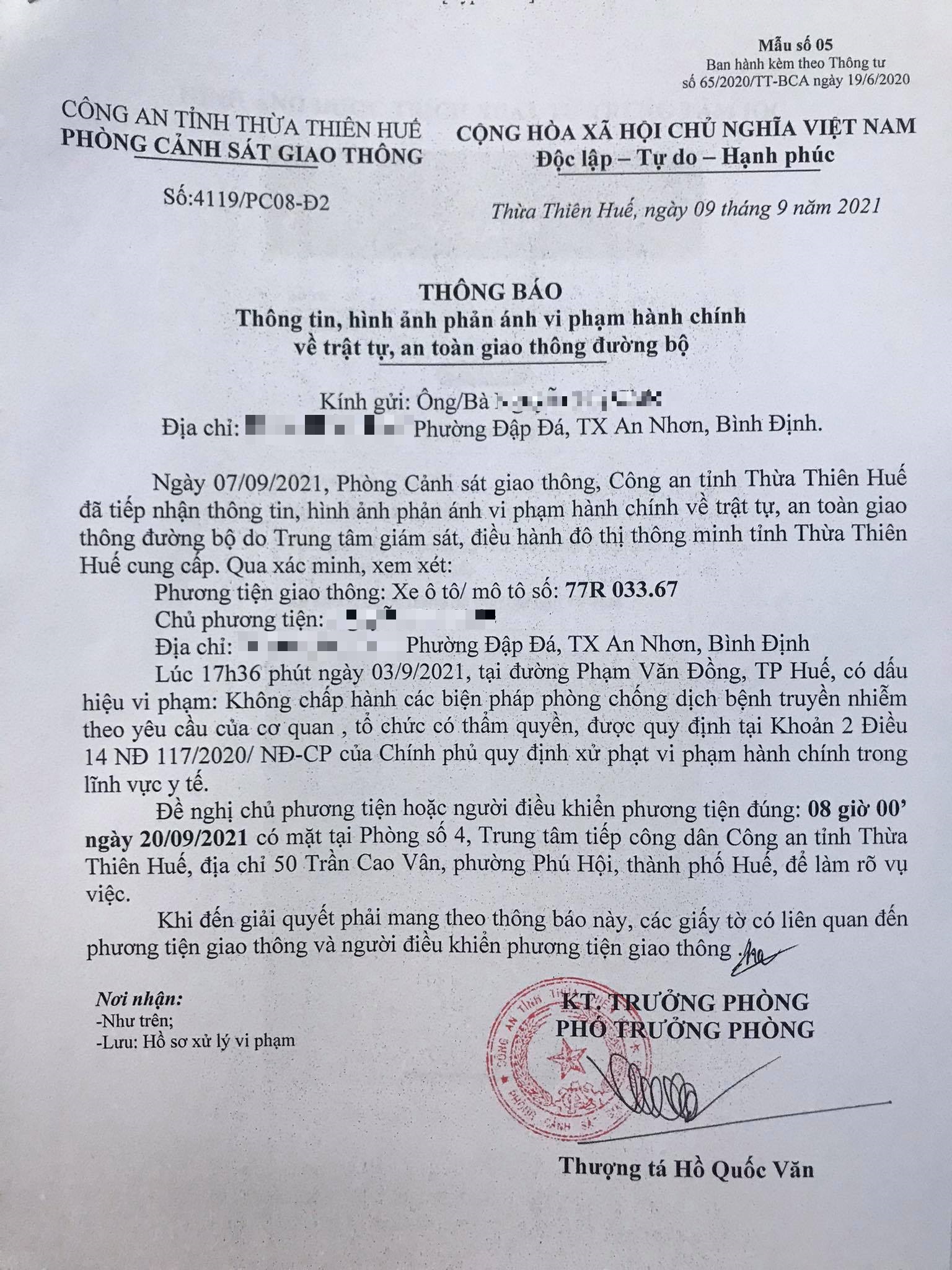 Phòng Cảnh sát giao thông đã lập hồ sơ, thông báo chủ phương tiện đến làm việc vào ngày 20/9/2021. Do hiện nay đã quá thời hạn nhưng chủ phương tiện vẫn chưa trình diện tại cơ quan, Phòng Cảnh sát giao thông sẽ gửi thông báo chặn kiểm định tại cơ quan đăng kiểm.