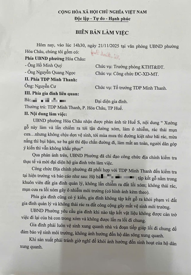 Sau khi phối hợp với Tổ dân phố Minh Thanh để kiểm tra hiện trường cho thấy: Hộ bà L.T.T.Sg đã tập kết gỗ nằm trong khuôn viên đất gia đình quản lý, không lấn chiếm, không thải rác, mụn cưa ra lối đi chung của xóm làm ô nhiễm môi trường.