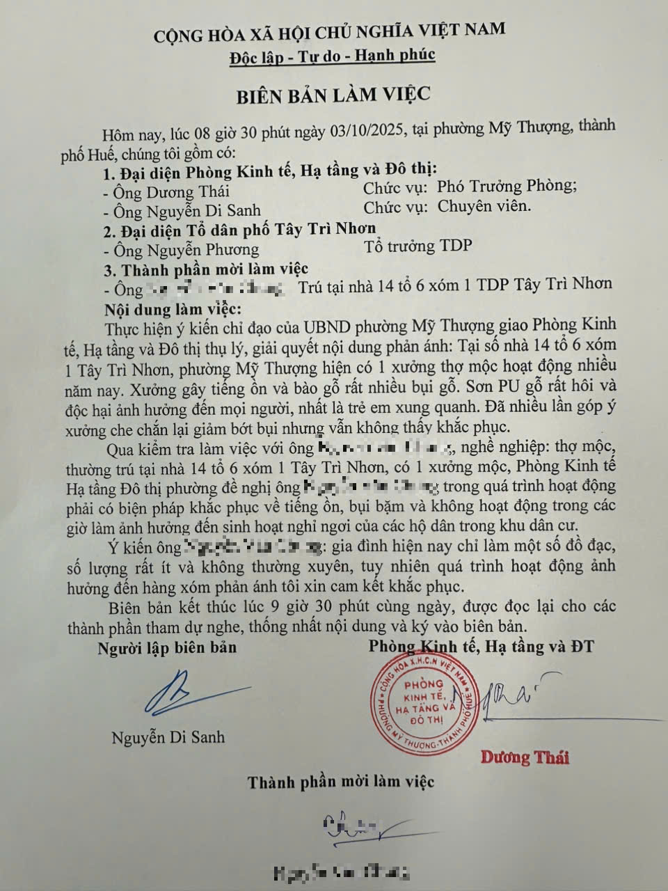 Qua kiểm tra, làm việc với ông N.V.C, nghề nghiệp thợ mộc, thường trú tại nhà 14, tổ 6, xóm 1 Tây Trì Nhơn, có 1 xưởng mộc. UBND phường đề nghị ông C trong quá trình hoạt động phải có biện pháp khắc phục về tiếng ồn, bụi bặm và không hoạt động trong các giờ làm ảnh hưởng đến sinh hoạt, nghỉ ngơi của các hộ dân trong khu dân cư.