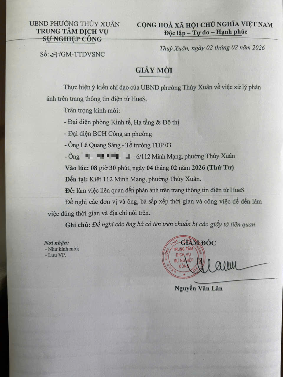 Sau khi tiếp nhận phản ánh, Trung tâm đã đến địa điểm trên nhưng chủ cơ sở đi xa, hiện không có mặt tại Huế để làm việc. Vì vậy, Trung tâm đã gửi giấy mời mời ông T.T.N.H vào lúc 8 giờ 30 phút ngày 30 thán 01 năm 2026 để làm việc. Tuy nhiên, đến thời điểm trên thì ông T.T.N.H vẫn vắng mặt không có lý do.
